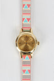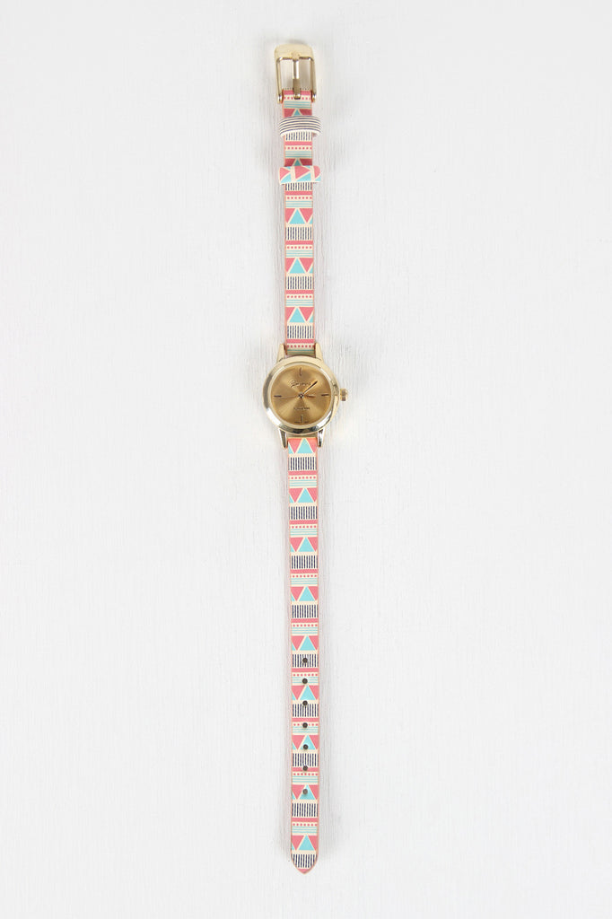 This watch features vegan leather band, geo pattern print, glossy metallic bezel, hour markers, and adjustable buckle closure.