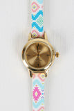 This watch features vegan leather band, Aztec pattern print, glossy metallic bezel, hour markers, and adjustable buckle closure.