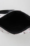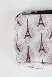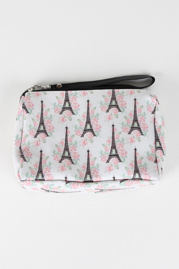This wristlet pouch features textured vegan leather, floral and Eiffel Tower pattern print, top zipper closure, and removable wrist strap.