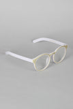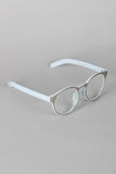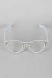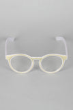 These glasses feature horn rim style plastic frame, round clear lenses, and front metallic accent.