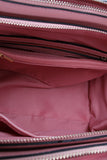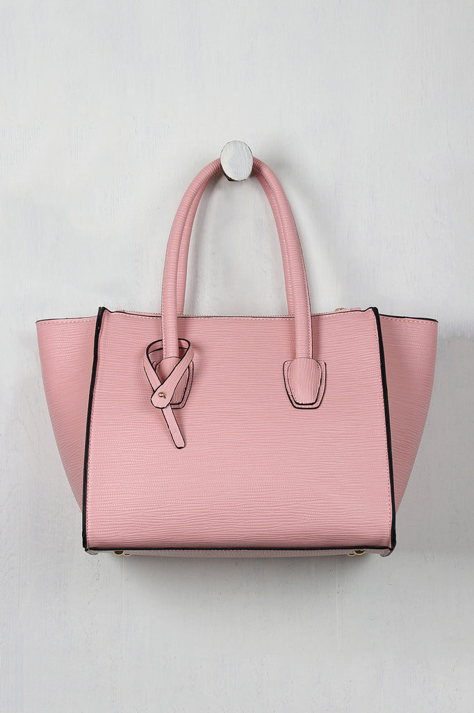 This trapeze satchel features striated vegan leather, detachable push pin closure loop embellishment, two zipper side pockets, and top zipper closure. Interior features multiple pockets and full lining. Bag is finished with top handles (6.25" drop) and removable buckle shoulder strap (21.5" drop).