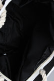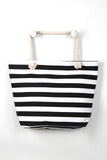 This striped pattern throughout and braided handles. Inside features full lining and an open pocket. Zipper top closure.