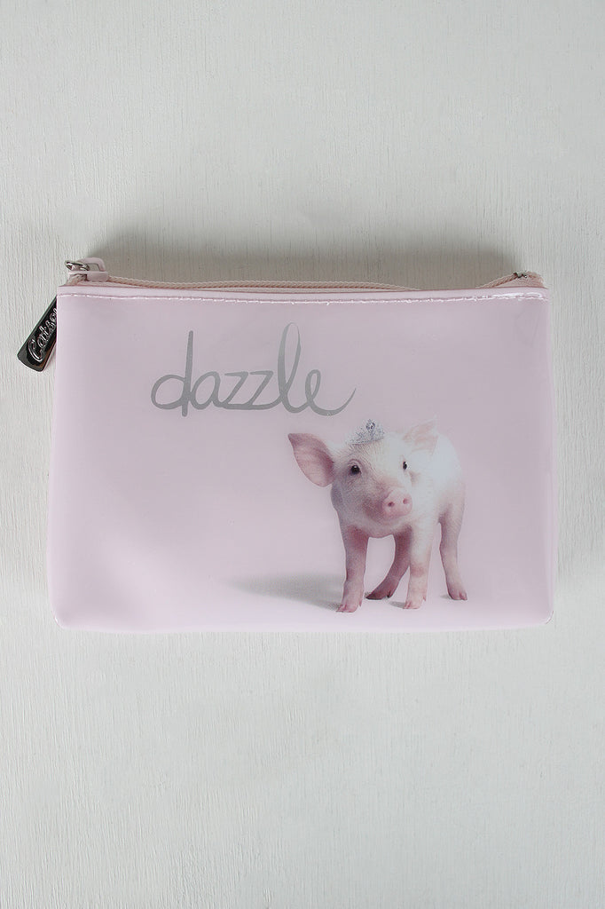 This charming pouch it perfect for diva. It features a cute piglet with a tiara print and the word dazzle, zipper closure, plastic fabrication, with a fabric lining.
