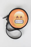 This cute coin purse features a circle design, vegan leather fabrication, grinning face emoji printed on it with a removable wrist strap.