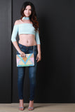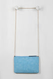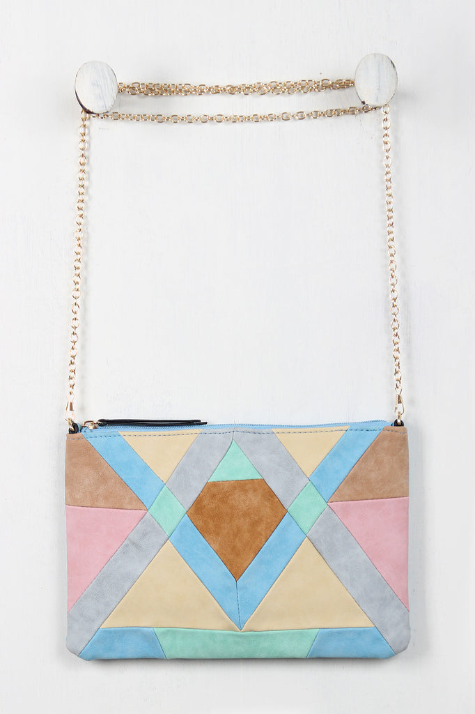 This clutch features vegan leather, a geometric patchwork design, top zipper closure, removable chain strap. Interior features a full lining, zipper pocket, and two slip pockets.