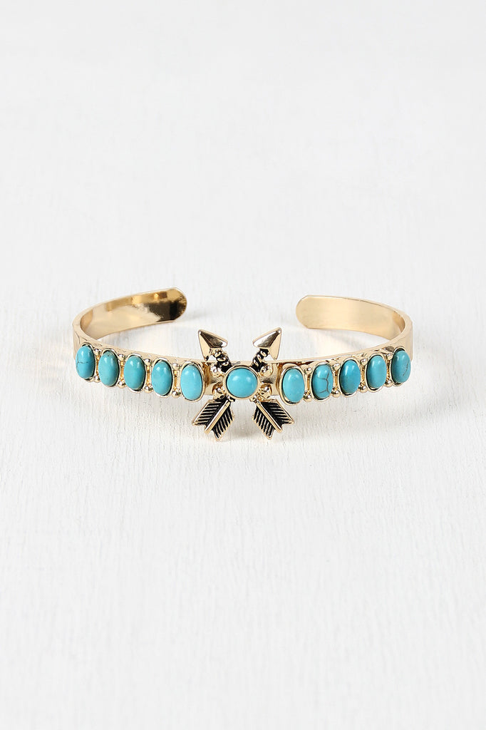 An open-ended bracelet featuring a hammered metallic band, a crossed arrow motif at the front, and oval faux turquoise stones. Nickel, lead, and cadmium compliant.