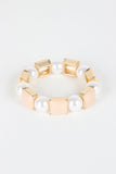 This cute bracelet features faux pearls, colored squares set in a gold toned setting and easy slip on elastic construction.