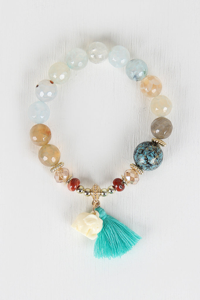 This bracelet features glass beads, elephant charm, single tassel accent, and easy slip on elastic construction.