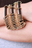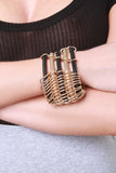 This edgy bracelet features stretchy tube chains wrapped in linked metallic rings.