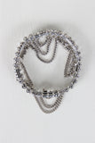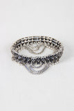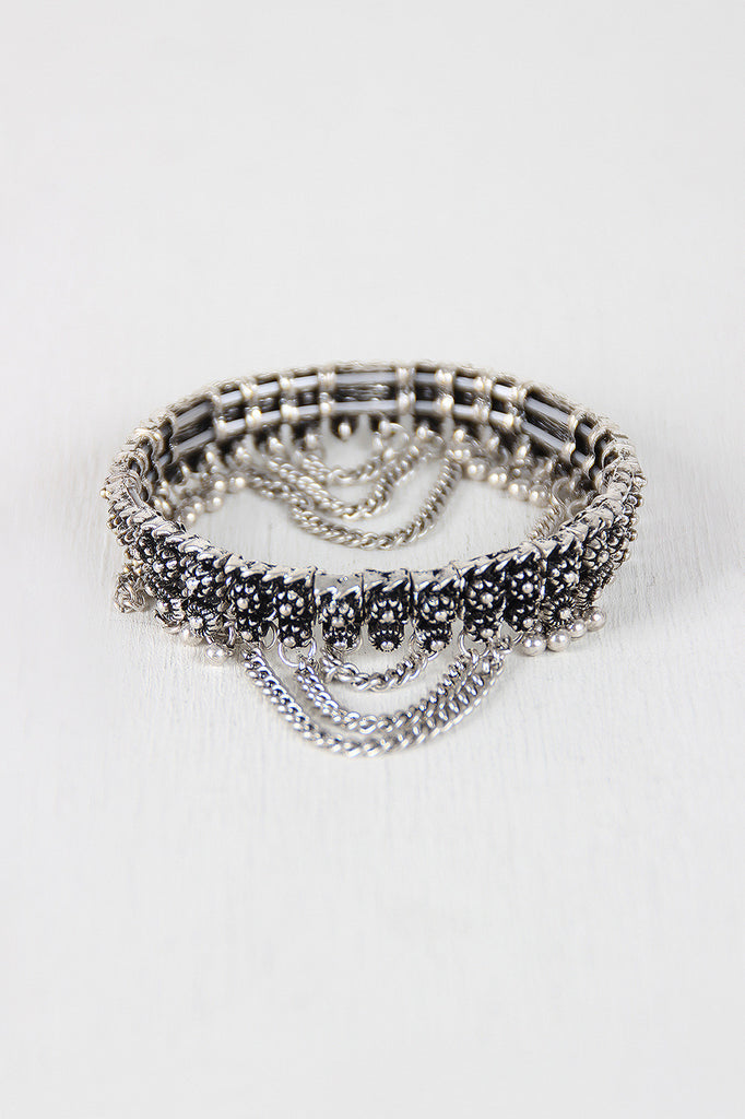 This bracelet , fit for an Aztec Princess, features metal square beads with small circular mandala adornments, and alternating sphere charms and draped chain. Easy slip on elastic construction.