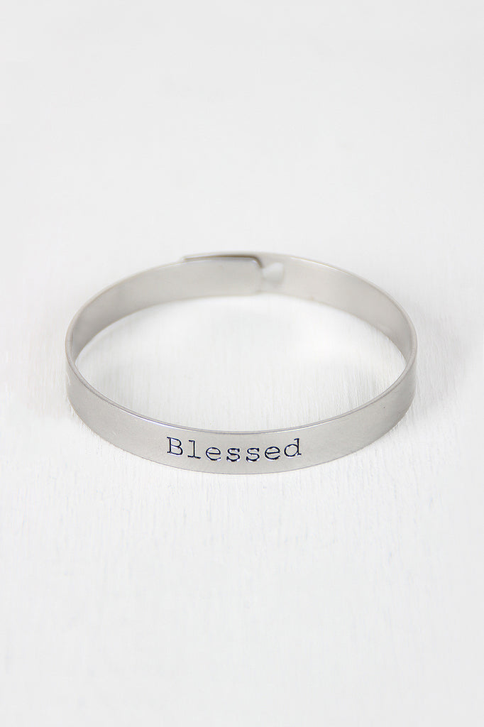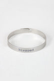 This simple cuff bracelet features stamped lettering that says "Blessed", a brushed metal finish, and a post and hole locking closure.