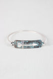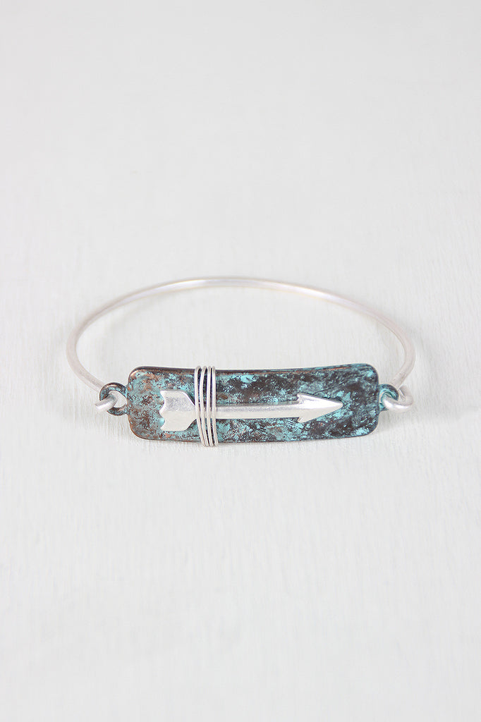 This bracelet features a wire design with a faux oxidized copper plate embellished with a silver arrow wrapped with wire, finished with a latch closure.