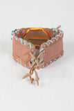 This artsy cuff bracelet features a leather fabrication , brushed metal plate, colorful embroidery thread details and a stone bead. pull string slip on closure.