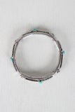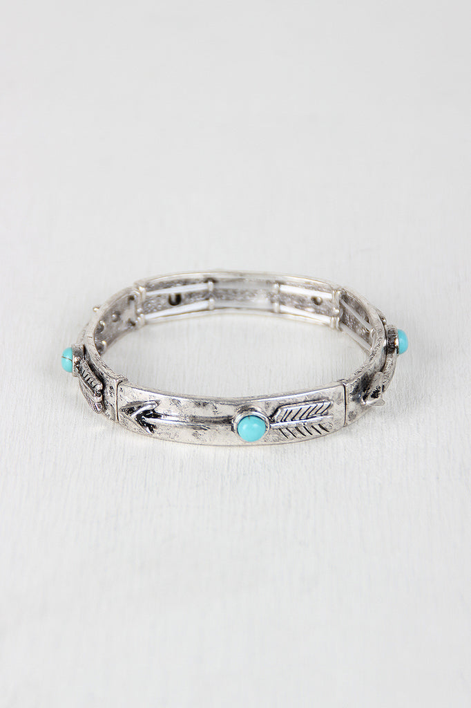 This bracelet features an arrow design plate bead. with a faux turquoise stone set in, vintage looking finish, and elastic construction for easy on/off.