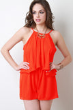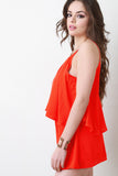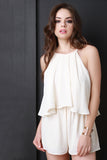 This romper is trapeze silhouette, featuring a flowy top tier. Pull on style. Lined. Designed with spaghetti straps and plugging back. Elasticized waist. Accessories sold separately. Made in U.S.A. 100% Polyester.