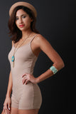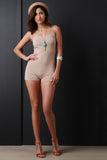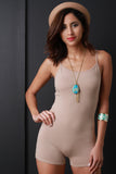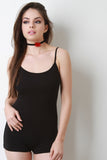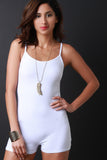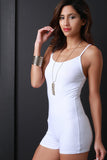 This sleeveless romper features a jersey knit fabric, spaghetti shoulder straps, scooped round neckline and open back with shorts bottom. Accessories sold separately. Made in U.S.A. 95% Cotton, 5% Spandex.