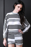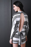 This romper features a smooth knit stripe fabrication, long dolman sleeves and mock neckline. Finished with shorts bottom with side pockets, an open back cutout with double button closure at nape and a self tie at back. Accessories sold separately. Made in U.S.A. 60% Acetate, 40% Rayon.