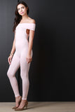 This sleek jumpsuit features soft jersey knit, off the shoulder design, subtle cut-outs, and taper cut legs. Accessories sold separately. Made in U.S.A. 95% Rayon, 5% Spandex.