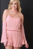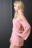This cute romper features an off the shoulder sweetheart neckline with boning, long sleeves, cinched high waisted seam and finished with shorts bottom. Accessories sold separately. Made in U.S.A. 100% Rayon.