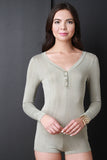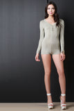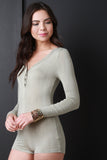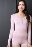 This chic romper features smooth stretch jersey, long sleeves, and a button-up v-neckline. Accessories sold separately. Made in U.S.A. 94% Rayon, 6% Spandex.