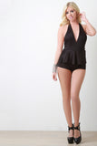 This romper features a deep v-neckline, open back construction, smooth stretchy knit fabrication, and peplum skirt design with shorts bottom half. Accessories sold separately. Made in U.S.A. 90% Polyester, 10% Spandex.