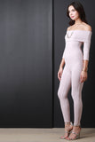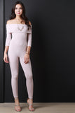 This jumpsuit features a ribbed knit fabrication, off shoulder bardot neckline, three quarter sleeves, and figure hugging silhouette. Finished with taper cut legs. Accessories sold separately. Made in U.S.A. 90% Polyester, 10% Spandex.