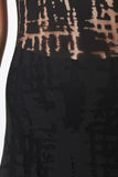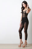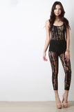 This jumpsuit features a semi-sheer mesh fabrication with distressed pattern throughout, scoop neckline, and sleeveless fit. Finished with taper cut legs. Accessories sold separately. Made in U.S.A. 60% Polyester, 40% Nylon.
