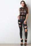 This bodysuit features a semi-sheer grid mesh fabrication, contrasting waistband, mock neckline, and sleeveless fit. Finished with a hidden rear zip-up closure. Accessories sold separately. Made in U.S.A. 90% Nylon, 10% Spandex.