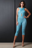 This romper features a textured knit fabrication, crisscross wrap design, keyhole cutout detail, sleeveless fit, and wide elasticized waist band. Finished with a capri-length hemline and exposed rear zip-up closure. Accessories sold separately. 68% Polyester, 29% Rayon, 3% Spandex.