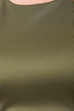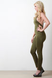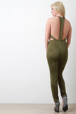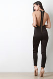 This jumpsuit features smooth stretch knit, side cut-outs, and single back band with zipper closure. Accessories sold separately. Made in U.S.A. 96% Polyester, 4% Spandex.