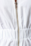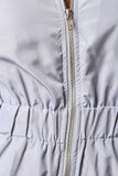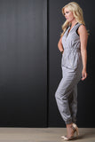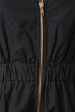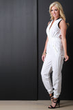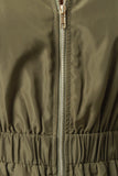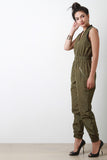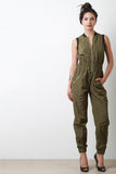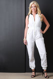 This bomber jumpsuit features a ribbed knit collar, sleeveless fit, wide elasticized cinched waist, and side zipper pockets. Finished with a front zip-up closure. Accessories sold separately. 100% Polyester.