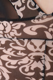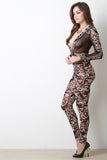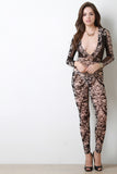 This jumpsuit features damask pattern semi-sheer mesh, deep plunge neckline, and long sleeves. Accessories sold separately. Made in U.S.A. 100% Polyester.