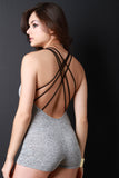 This simple yet chic romper features a marled knit fabrication, scoop neckline, triple thin straps to a crisscross back detail, and curve hugging fit. Accessories sold separately. Made in U.S.A. 92% Acrylic, 8% Nylon.