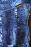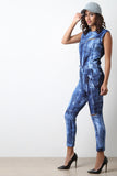 This jumpsuit features a denim print throughout, mock neckline, zipper opening details at chest and knees, two front pockets, and elasticized waist band with self-tie drawstrings. Finished with a rear zip-up closure, and cuffed hemline. Accessories sold separately. Made in U.S.A. 96% Polyester, 4% Spandex.