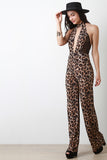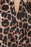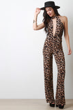 This flirty jumpsuit features smooth stretch fabric, leopard print, semi-sheer mesh, mock neck, front cutout, and open back. Accessories sold separately. Made in USA. 95% Polyester, 5% Spandex.