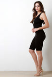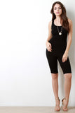 This basic romper features a jersey knit fabrication, scoop neckline and back, sleeveless fit, and finished with a bermuda-length hemline. Accessories sold separately. Made in U.S.A. 95% Cotton, 5% Spandex.