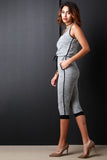 This casual jumpsuit features a marled knit fabrication with contrasting trim, scoop neckline, and sleeveless fit. Finished with an elasticized waist with self-tie drawstring detail, capri-length bottom, and elasticized cuffed hem. Accessories sold separately. 60% Polyester, 35% Viscose, 5% Elastane.