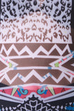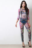 This jumpsuit features semi-sheer mesh, abstract geo print, round neckline, long sleeves, and back cutout with single button closure at nape. Accessories sold separately. Made in USA. 100% Polyester.
