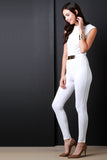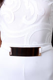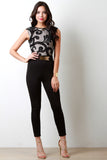 This chic jumpsuit features a burned-out pattern mesh top with contrasting solid bottom, attached gold-plated belt detail, sleeveless fit, and round neckline. Finished with an open back with button hook closure at nape, zip-up back fastener, and curve-hugging fit. Accessories sold separately. Made in U.S.A. 100% Polyester.