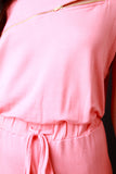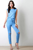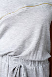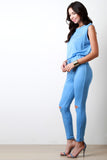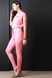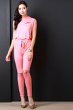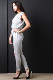 This jumpsuit features a French Terry cloth fabrication, front angled zipper detail, knee slit openings, sleeveless fit, and elasticized waist with self-tie drawstrings. Finished with a back zip-up closure, and taper cut legs. Accessories sold separately. Made in U.S.A. 87% Polyester, 9% Rayon, 4% Spandex.