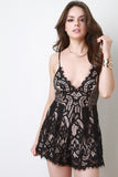 This romper features lace overlay, deep v-neckline, spaghetti straps, lace up back, and finished with lining. Accessories sold separately. 100% Nylon.