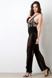 This daring bodysuit features a burned-out mesh pattern with constrasting solid bottom, plunging v-neckline with strap detail, and a strappy back construction. Finished with a double snap button closure at crotch. Accessories sold separately. Made in U.S.A. 60% Polyester, 40% Nylon.