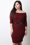 A plus size ribbed knit dress featuring a foldover off-the-shoulder design, three-quarters sleeves, and a bodycon fit with slightly ruched sides at the hem. Includes metallic plate belt with stud accents, elastic construction, and double snap button closure. Other accessories sold separately. 96% Polyester, 4% Spandex.