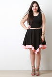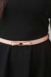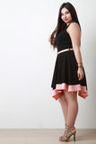 This gorgeous plus size fit & flare dress features a round neckline, sleeveless design, and contrasting handkerchief hem trim. Dress come with removable tuxedo bow accent vegan leather belt. Other accessories sold separately. Made in U.S.A. 96% Polyester, 4% Spandex.