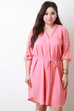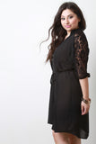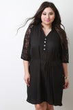 This plus size dress features lightweight solid fabric, contrast floral lace accent, button-up v-neckline, bishop cuff sleeves, and self-tie string. Accessories sold separately. 100% Polyester. Contrast: 92% Nylon, 8% Spandex.