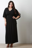 This plus size maxi dress features an empire waist band, v-neckline, and cold shoulder butterfly sleeves. Accessories sold separately. 95% Polyester, 5% Spandex.
