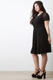 This plus size fit & flare dress features a round neckline, contrast mesh with a beautiful beadwork embroidery design, short sleeves construction, cinched waistline, and flare skirt. Accessories sold separately. Made in U.S.A. Self: 95% Polyester, 5% Spandex. Contrast: 90% Nylon, 10% Spandex.
