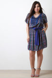 This plus size dress features a printed woven knit fabrication, chain detail round neckline with macram and fringe, and cinched waist with tie. Finished with short sleeves construction and an a-line fit. Accessories sold separately. 100% Rayon.