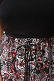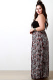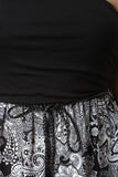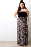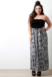 This plus size dress features a solid jersey knit strapless tube top with a contrasting paisley boho print bottom, empire waist, and includes a braided belt. Finished with a maxi-length hemline. Accessories sold separately. Made in U.S.A. Self: 100% Polyester, Contrast: 97% Rayon, 3% Spandex.