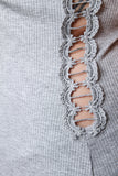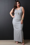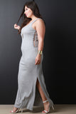 This plus size maxi dress features a ribbed knit fabrication, scooped neckline, sleeveless design, beautiful lace inset at sides, and finished with side slit. Accessories sold separately. 96% Rayon, 4% Spandex.